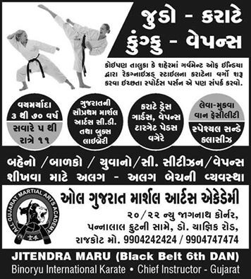 Judo, Karate, Kung Fu and Weapons Classis is now in Rajkot City. All Gujarat Martial Arts Academy is presents by Jitendra Maru. Judo Karate Martial Arts Classes has organized by Jitendra Maru in Rajkot at Yagnik Road.
