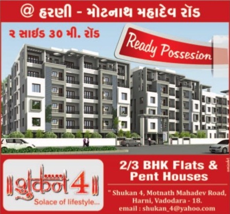 Shukan 4 in Vadodara is presented 2 BHK & 3 BHK Flats and Pent Houses with Ready Possession at Harni Vadodara. Shukan 4 is a very beautiful design and nice location in Vadodara.